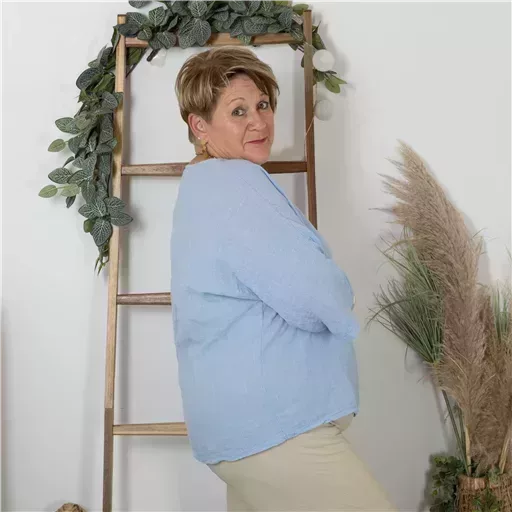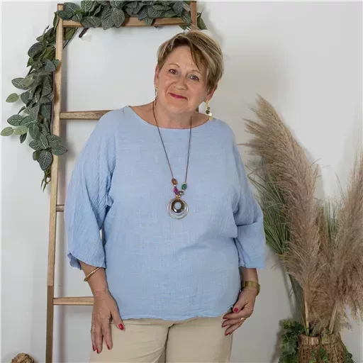 Tunique manches 3/4 unie. Léger Col rond. Coupe estivale et légèreté absolue avec sa composition en coton. De fabrication italienne, ce modèle est ici porté avec un jean Voggo à 18.90€.