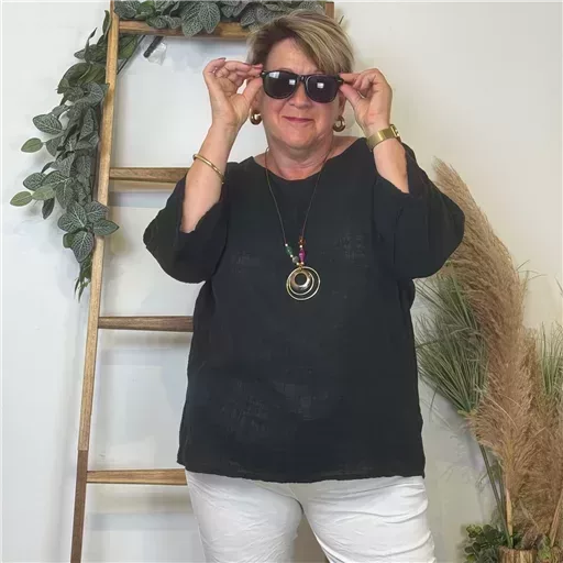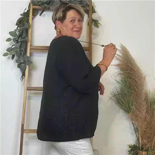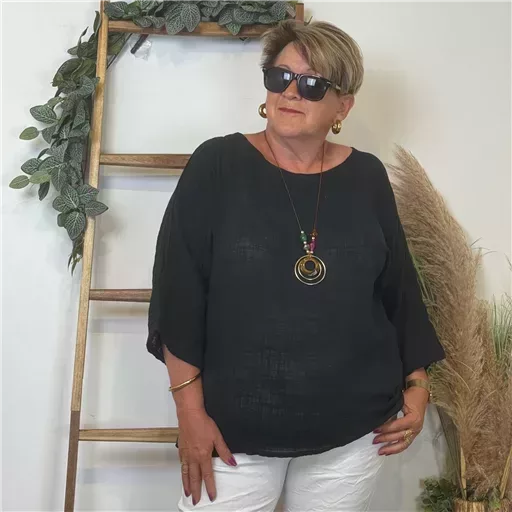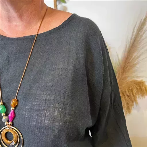 Tunique manches 3/4 unie. Léger Col rond. Coupe estivale et légèreté absolue avec sa composition en coton. De fabrication italienne, ce modèle est ici porté avec un jean Voggo à 18.90€.