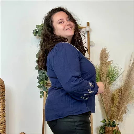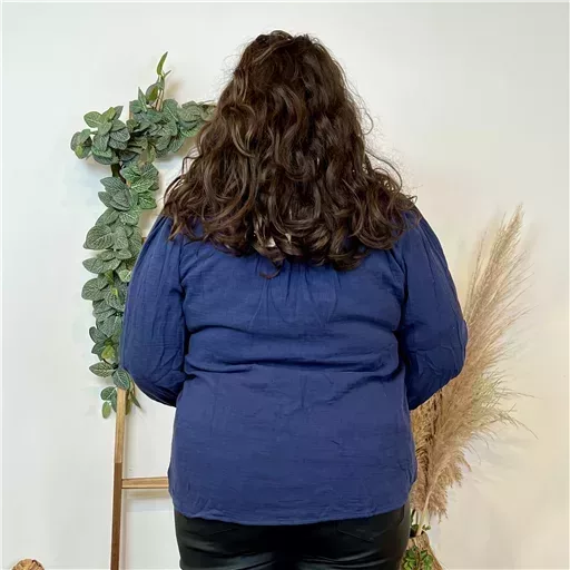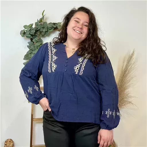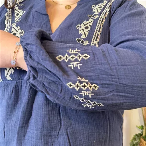 Cette blouse unie en coton se distingue par ses délicates broderies contrastées inspirées du motif maya. Les manches longues offrent une élégance intemporelle, tandis que le col en V met en valeur le décolleté avec une touche de sophistication. Des détails fantaisie ornant le col et les avant-bras apportent une note unique et raffinée à la pièce. Confortable et chic, et 100% coton, elle est tout simplement parfaite.
