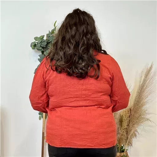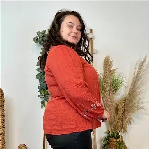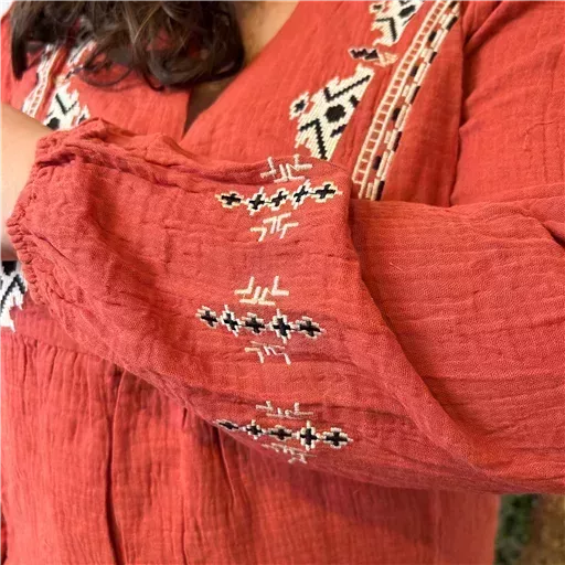 Cette blouse unie en coton se distingue par ses délicates broderies contrastées inspirées du motif maya. Les manches longues offrent une élégance intemporelle, tandis que le col en V met en valeur le décolleté avec une touche de sophistication. Des détails fantaisie ornant le col et les avant-bras apportent une note unique et raffinée à la pièce. Confortable et chic, et 100% coton, elle est tout simplement parfaite.