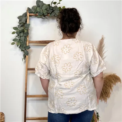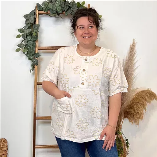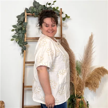 Une blouse signée Christy qui se porte facilement en cette saison. Blouse fluide imprimée “Jolies Formes”