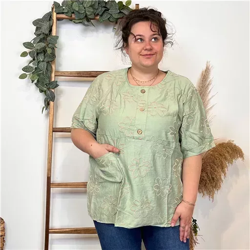 Une blouse signée Christy qui se porte facilement en cette saison. Blouse fluide imprimée “Jolies Formes”