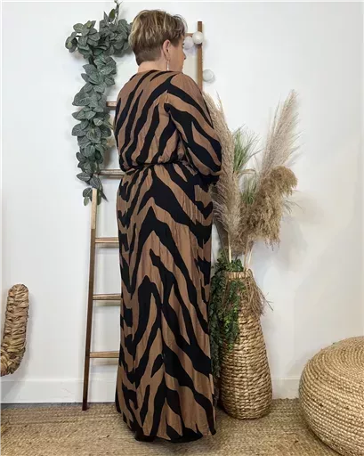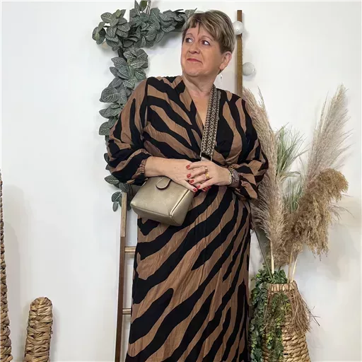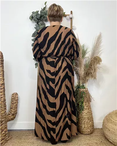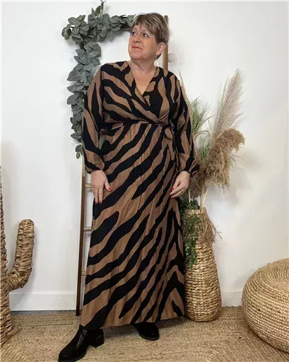 Robe longue très colorée, motif tacheté avec de petites feuilles dorées proposée du 44 au 52.