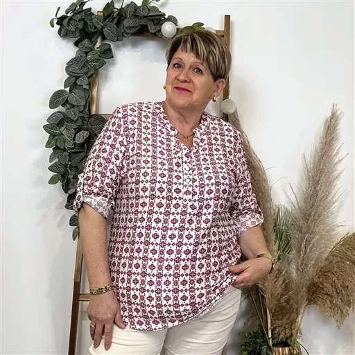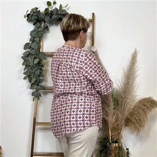 Un bel imprimé “Mozaïque” pour cette blouse signée Christy qui se porte facilement en cette saison. Blouse fluide imprimée “Jolies Formes”, ravissante aux manches longues avec finition poignets et lien pour remonter les manches. Encolure en V. Encolure bien dégagée, fermée par 3 boutons. Forme droite. Facile à associer avec nos pantalons Confort JST, nos jeans Voggo à 18.90€ ou nos pantalons C’Mélodie.