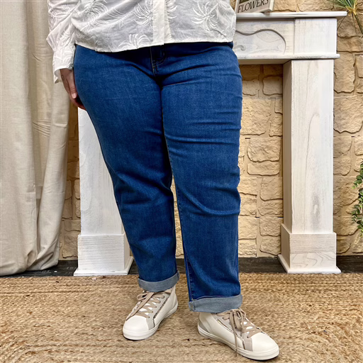 Jean mom à la coupe droite et confortable, taille haute pour une silhouette flatteuse. Confectionné en denim souple, il offre un bon maintien tout en restant agréable à porter au quotidien. Délavage bleu, facile à associer avec tous vos looks, du plus casual au plus chic.