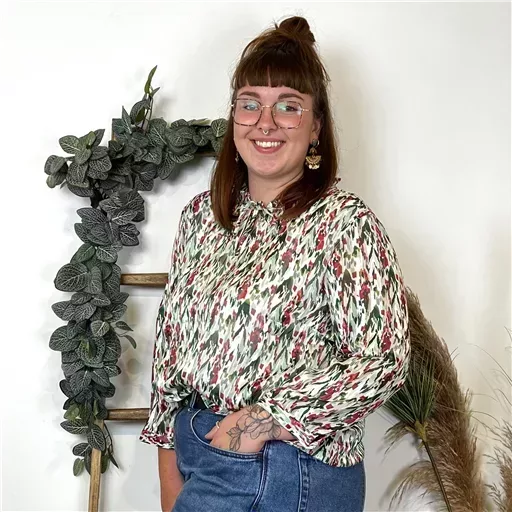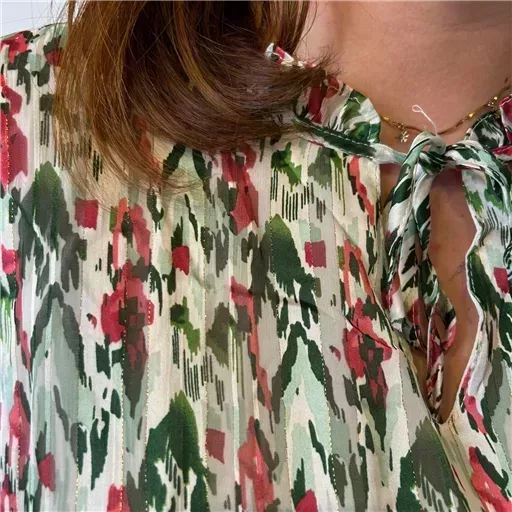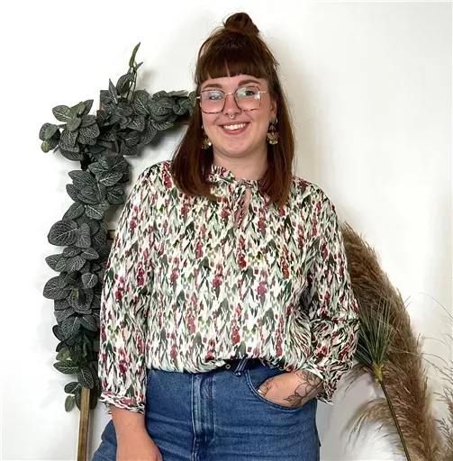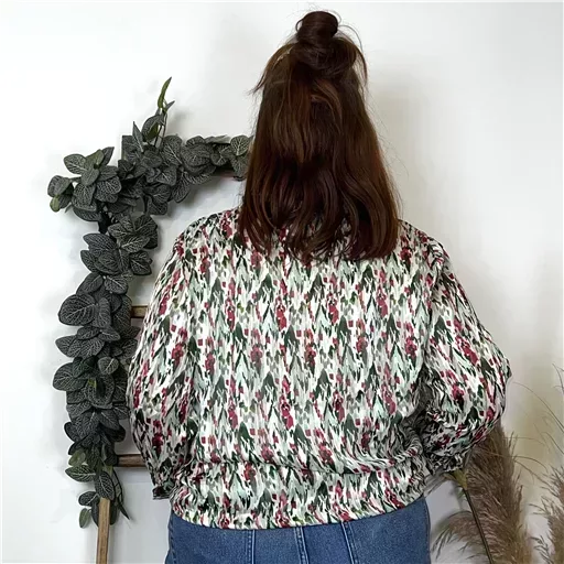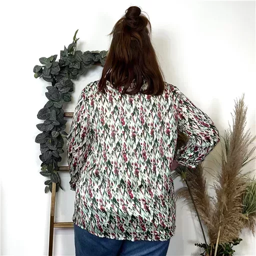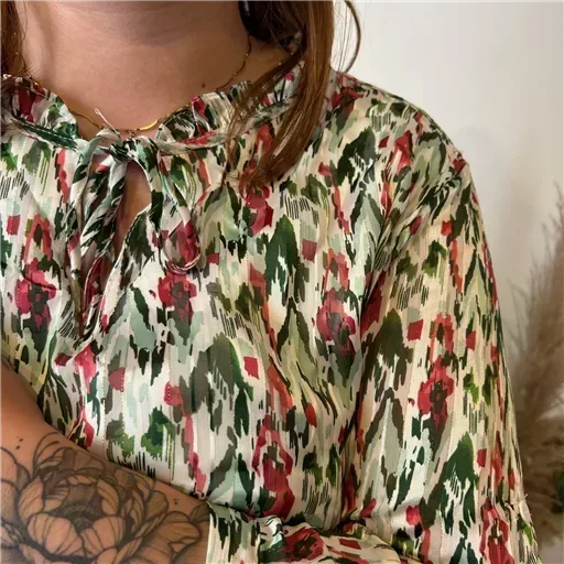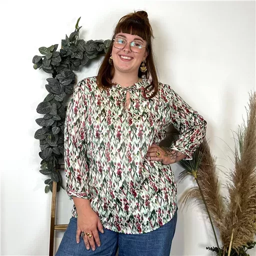 Blouse col haut froncé avec une ouverture sur le devant et 2 liens au niveau du cou griffé Christy, manches longues, un modèle tendance et frais pour un look chic. Imprimé abstrait. Modèle proposé de la Taille 44 au 52. Facile à associer avec un gilet, une jupe ou un jean Voggo à 18.90€.