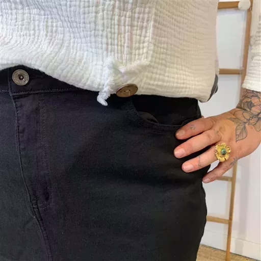 Cette jupe en jean teintée Voggo fendueest une pièce incontournable. Ce modèle se distingue par sa simplicité et ses rivets métalliques sur les poches. Une jupe longue femme fendue à l’arrière et à la coupe très légèrement évasée, confectionnée dans une matière extensible ultra confortable. Cette jupe se porte aussi bien avec un t-shirt, ou une blouse ou un pull quand les jours se rafraichissent. Vous connaissez les jeans V. by BleuClair, vous apprécierez la version jupe voggo.