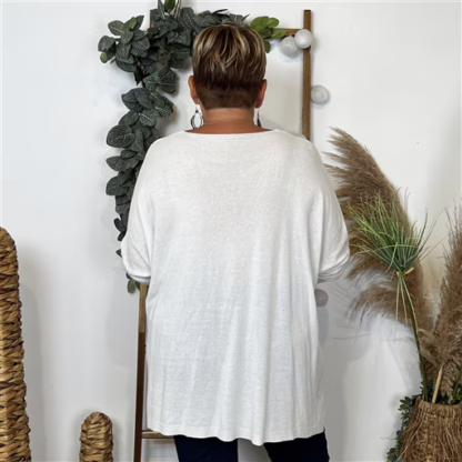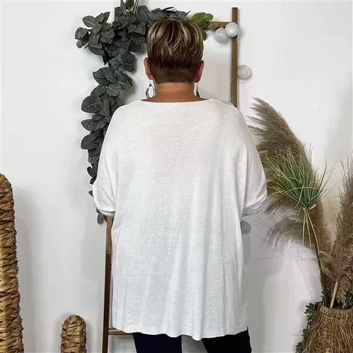 Pull uni col v, leger coupe trapèze, oversize manches tombantes et étroites, Maille fantaisie sur le devant, fendu sur le coté