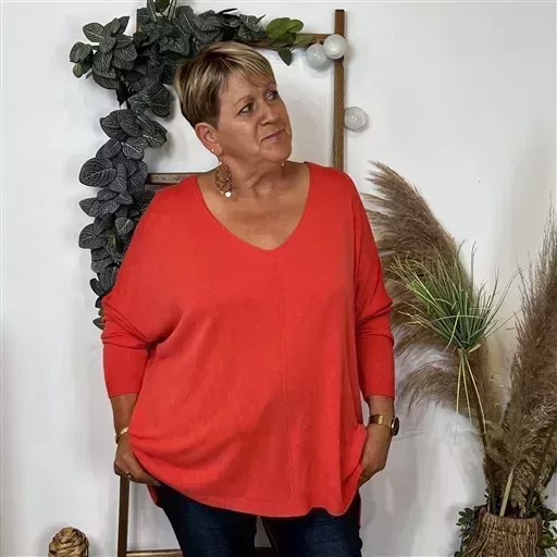 Ce pull « JOLIES FORMES » est un pull à col V, à manches longues et à la coupe loose. Il est uni et présente une couture sur le devant. Ce pull est doux et confortable, et il convient aux femmes de tailles 44 à 52. Les manches sont ressérées au niveau des avants bras, ce qui permet de mettre en valeur les formes. La longueur du pull est sous les fesses, ce qui le rend confortable à porter. L’ouverture sur les côtés permet de le porter de manière casual ou plus élégante. Pour un look casual, portez-le avec un pantalon Chino ou un jean slim VOGGO.