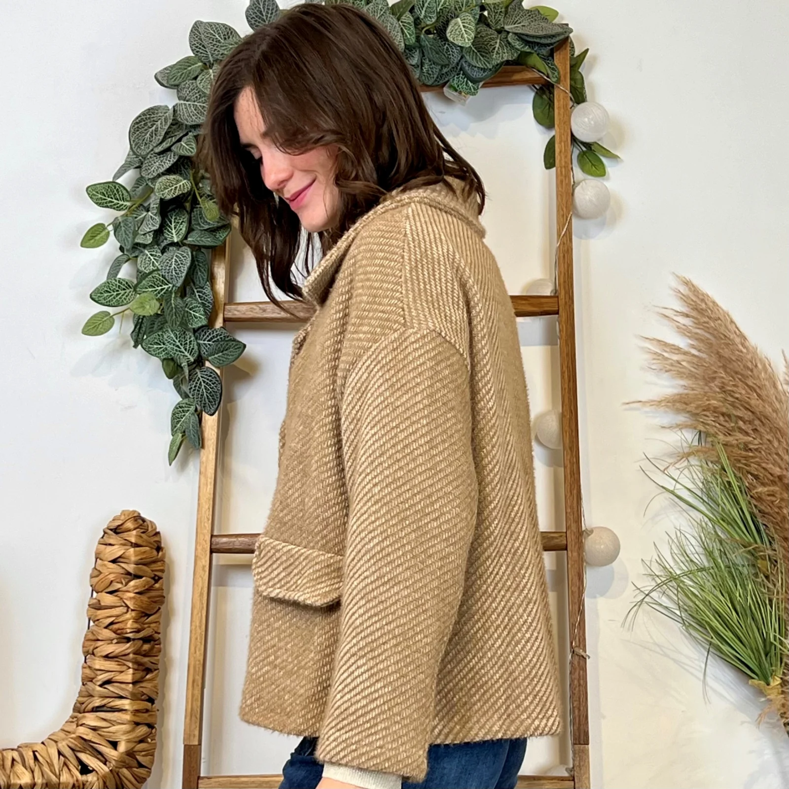 L’équipe BleuClair vous propose cette petite veste de fabrication italienne qui vous comblera en toute saison. Découvrez notre veste mi-longue en suédine pour Femme. Ici associée avec un jean Voggo et un pull leger. La pièce idéale pour cette sain afin d’apporter une petite touche chic à votre tenue.