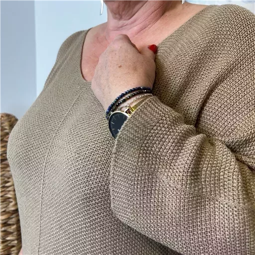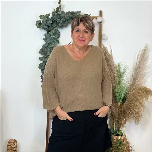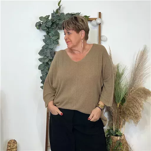 Modèle aux manches 3/4 col V avec un liseret devant, idéal pour le début de saison. Facile à porter sur un jean taille Haute Voggo et une gilet. De fabrication italienne, ce modèle est proposé en taille unique. Il conviendra du 42 au 50 en fonction des morphologies. Maille nid d abeille.