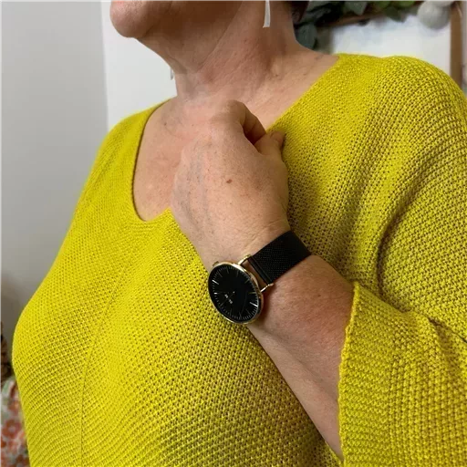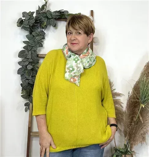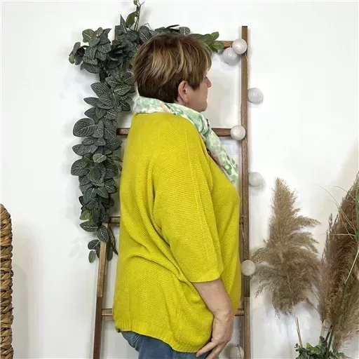 Modèle aux manches 3/4 col V avec un liseret devant, idéal pour le début de saison. Facile à porter sur un jean taille Haute Voggo et une gilet. De fabrication italienne, ce modèle est proposé en taille unique. Il conviendra du 42 au 50 en fonction des morphologies. Maille nid d abeille.