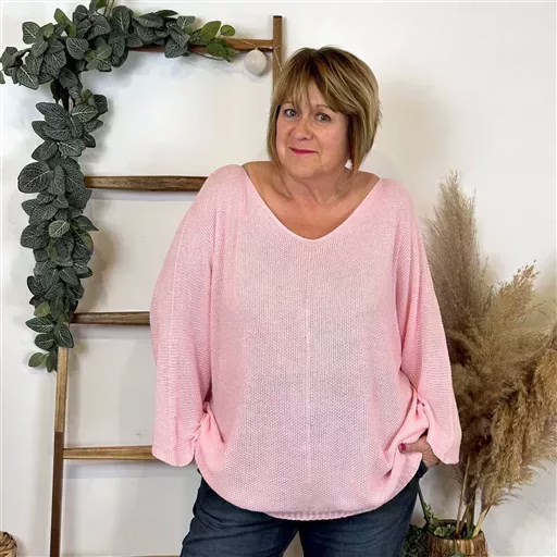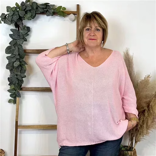 Modèle aux manches 3/4 col V avec un liseret devant, idéal pour le début de saison. Facile à porter sur un jean taille Haute Voggo et une gilet. De fabrication italienne, ce modèle est proposé en taille unique. Il conviendra du 42 au 50 en fonction des morphologies. Maille nid d abeille.