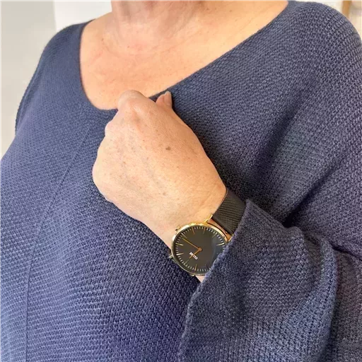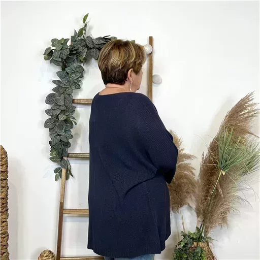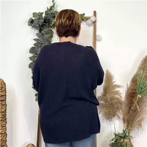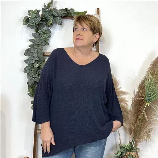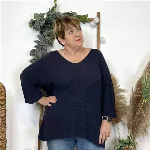 Modèle aux manches 3/4 col V avec un liseret devant, idéal pour le début de saison. Facile à porter sur un jean taille Haute Voggo et une gilet. De fabrication italienne, ce modèle est proposé en taille unique. Il conviendra du 42 au 50 en fonction des morphologies. Maille nid d abeille.