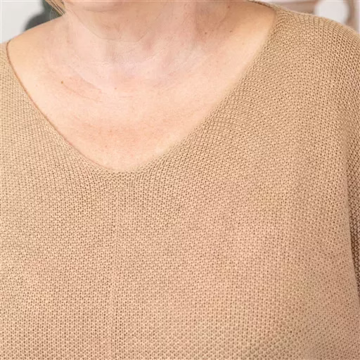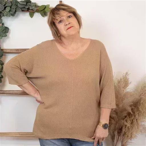 Modèle aux manches 3/4 col V avec un liseret devant, idéal pour le début de saison. Facile à porter sur un jean taille Haute Voggo et une gilet. De fabrication italienne, ce modèle est proposé en taille unique. Il conviendra du 42 au 50 en fonction des morphologies. Maille nid d abeille.