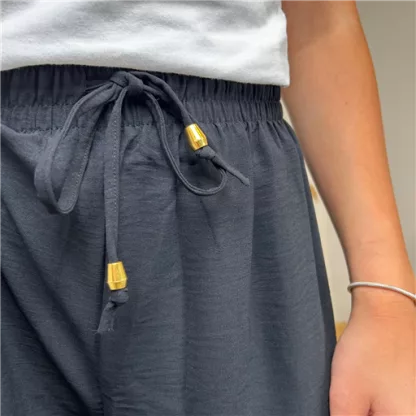 Très confortable ce pantalon multiplie les bons points. Outre son PRIX MINI ! Une fibre légère crêpée avec de la tenue. Une coupe large , une belle profondeur, Bande plate élastiquée tout autour de la taille il est très agréable à porter, Son liennouer lui apporte une touche de fantaisie … De quoi composer un look décontracté avec une tunique et/ou un pull coloré. Ce modèle de pantalon dans l’air du temps conviendra du 36 au 40. A porter avec une gilet ou un pull Loose.