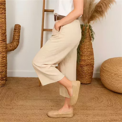 Ce pantalon flare en longueur 7/8ème en viscose est une pièce incontournable. Ce modèle se distingue par sa simplicité et sa belle ceinture. Un pantalon femme à la coupe évasée, confectionné dans une matière légère ultra confortable. Ce modèle se porte aussi bien avec un T-shirt, ou une blouse ou un pull quand les jours se rafraichissent.