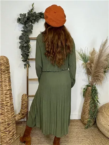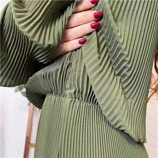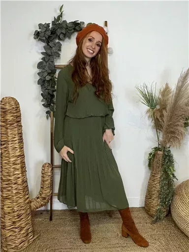 Beaucoup d’originalité pour cette robe doublée au plissé permanent de fabrication italienne ! Col cache coeur. ceinturée par un élastique au niveau de la taille. Manches floues, longues avec poignet élastiqué. La partie basse est plissée et doublée jusqu’à mi-mollet. Proposé en taille unique ce modèle conviendra jusqu’à une taille 44. Avec ce modèles nous vous conseillons nos collants magiques.