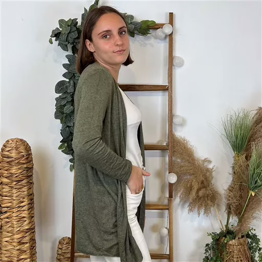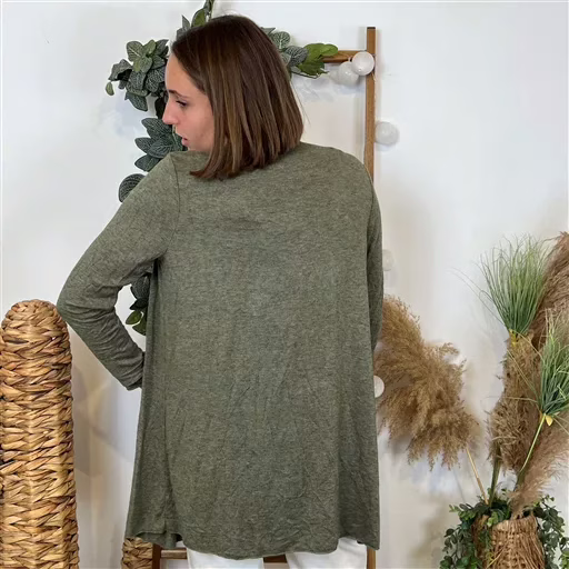 Modèle contenant de la laine. Coupe droite, légèrement Oversize, manches et absence de col.