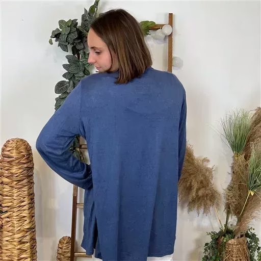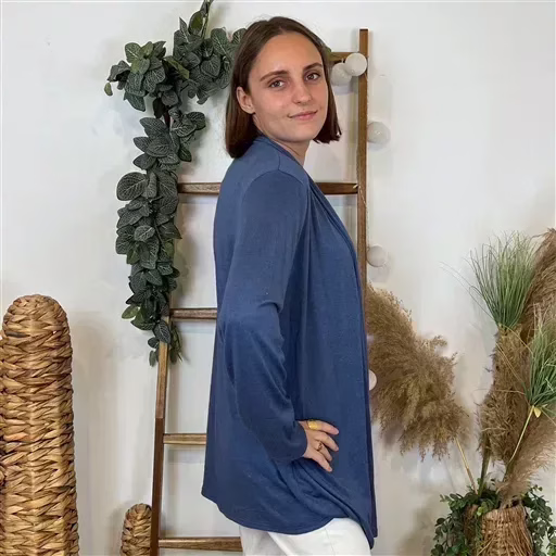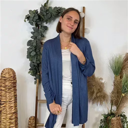 Modèle contenant un petit peu de laine. Coupe droite, légèrement Oversize, manches et col châle.