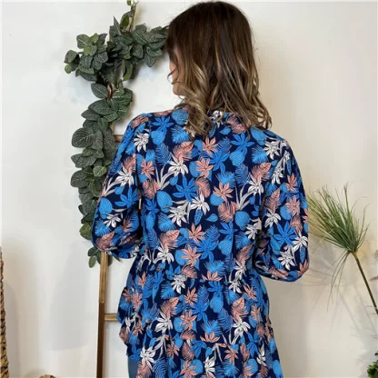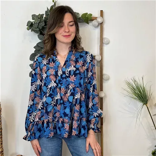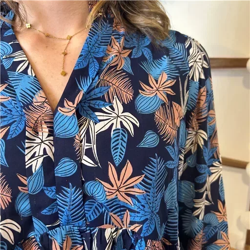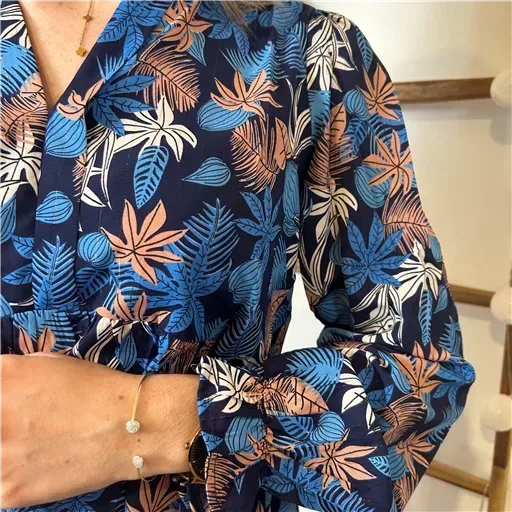 Blouse à l’imprimé tropical, avec un léger fil doré dans la trame, proposée du 36/38 au 38/40, nous vous conseillons de choisir cette blouse dans votre taille habituelle. Mesures à plat: