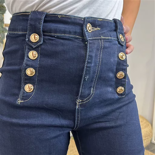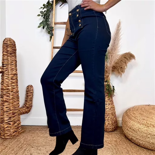 Ici en version Officier avec son boutonnage doré sue le devant… Ce « Wide Leg » est une coupe de jean ample et confortable, qui convient à de nombreuses morphologies. Resserré à la taille et élargi aux chevilles, c’est un pantalon qui allonge la silhouette et qui ne colle pas au corps.