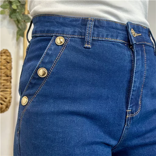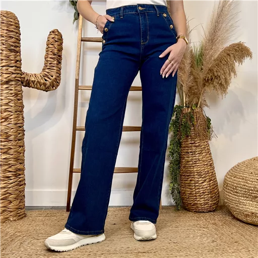 Ce jean Flare, de la marque Voggo est fabriqué dans un tissu de qualité. Fantaisie avec ses boutons officier. Il est disponible dans une large gamme de tailles, de la 36 au 44. La coupe flare allonge la jambe et donne une silhouette élégante. Les 6 boutons de chaque côté des poches sont une caractéristique distinctive de ce pantalon. Ils lui confèrent un style unique et raffiné. Ce pantalon peut être porté de différentes manières. Il peut être associé à une blouse ou un T-shirt pour une tenue décontractée ou à un Pull ou un blazer pour une tenue plus habillée.