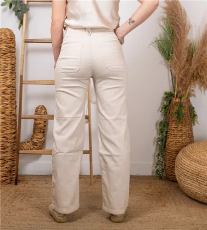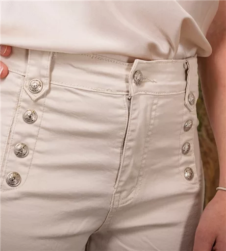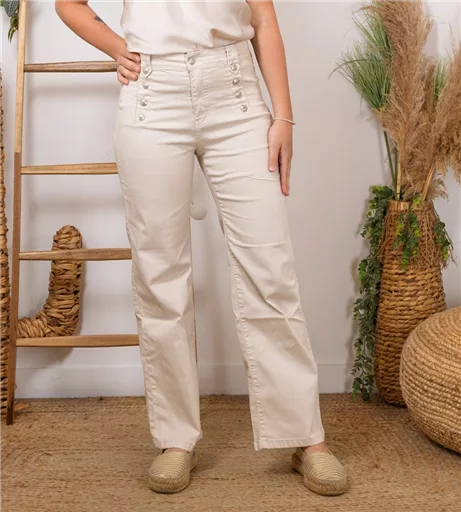 Ce jean flare, avec boutonnage sur le devant avec 4 boutons fantaisies, de la marque Voggo est fabriqué dans un tissu de qualité. Fantaisie avec ses boutons officier. Il est disponible dans une large gamme de tailles, de la 36 au 44. . Ce pantalon peut être porté de différentes manières. Il peut être associé à une blouse ou un T-shirt pour une tenue décontractée ou à un pull ou un blazer pour une tenue plus habillée.