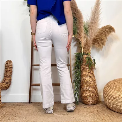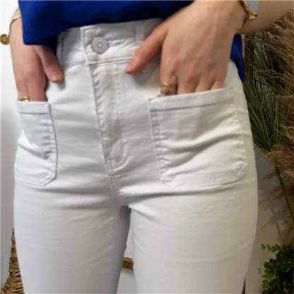 Ce jean Flare de la marque Voggo est fabriqué dans un tissu de qualité, coupe seventies avec ses 2 poches plaquées. Il est disponible dans une large gamme de tailles, de la 36 au 44. La coupe flare allonge la jambe et donne une silhouette élégante.2 poches plaquées de chaque côté des hanches sont une caractéristique distinctive de ce pantalon. Ils lui confèrent un style unique et raffiné. Ce pantalon peut être porté de différentes manières. Il peut être associé à une blouse ou un T-shirt pour une tenue décontractée ou à un pull ou un blazer pour une tenue plus habillée.