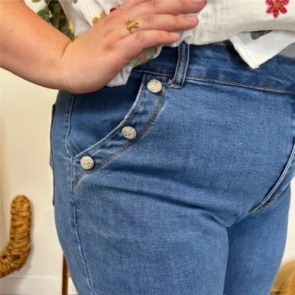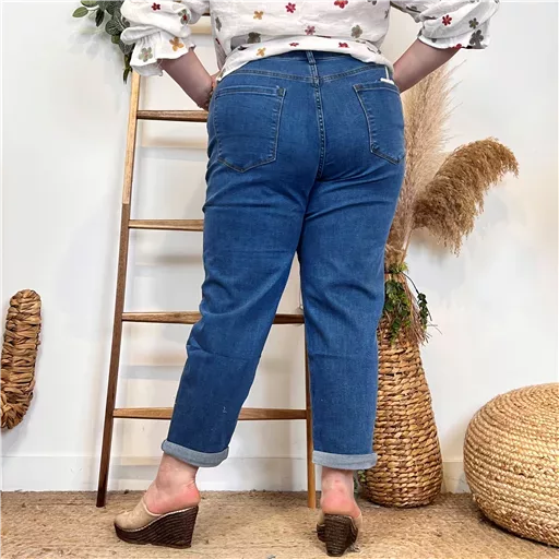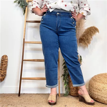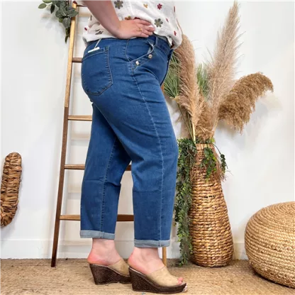 Ce jean 7/8ème Mom Fit, de la marque Voggo est fabriqué dans un tissu de qualité. Fantaisie avec ses boutons officier au niveau des poches. Il est disponible dans une large gamme de tailles, de la 36 au 44. Coqueluche des années 70, le jean mom-fit Voggo reste un indispensable du dressing. Il est parfait pour les femmes ayant une taille peu marquée, des hanches et des épaules de largeurs égales et des silhouettes fines et élancées (morphologie en H). Il convient aussi très bien aux femmes qui ont des jambes fines ou plus étroites que le haut de leur corps (morphologie en V). Ce pantalon peut être porté de différentes manières. Il peut être associé à une blouse ou un T-shirt pour une tenue décontractée ou à un Pull ou un blazer pour une tenue plus habillée.
