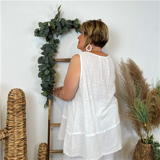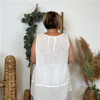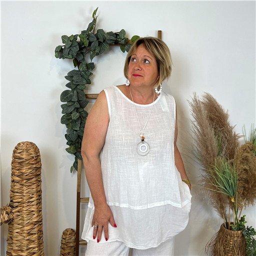 Coup de coeur de notre équipe pour nos clientes “Jolies Formes”. D’une belle ampleur, ce débardeur bi-matière à la coupe trapèze sans manche a un joli col rond. Ce débardeur en coton, se portera en mode casual sur unjean voggo ou un legging. Vendu avec un collier fantaisie
