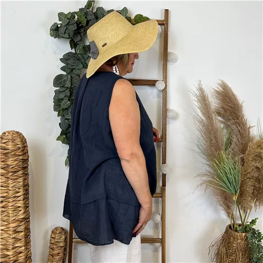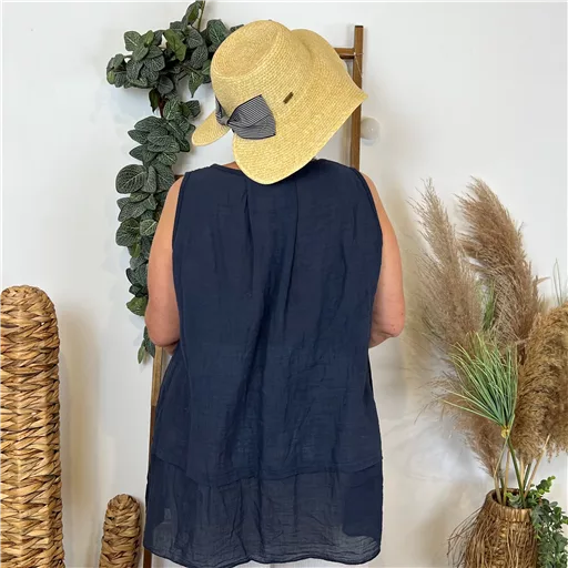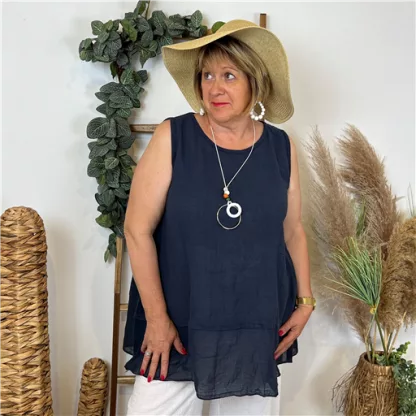 Coup de coeur de notre équipe pour nos clientes “Jolies Formes”. D’une belle ampleur, ce débardeur bi-matière à la coupe trapèze sans manche a un joli col rond. Ce débardeur en coton, se portera en mode casual sur unjean voggo ou un legging. Vendu avec un collier fantaisie