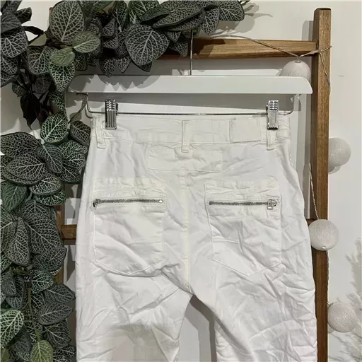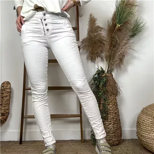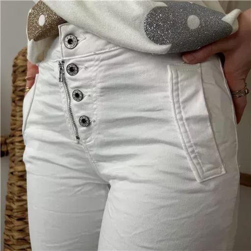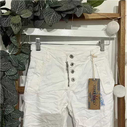 Le modèle phare de la marque avec le « délavage été ». Taille semi haute, 4 boutons et zip. jean SLIM 5 poches. Les 2 poches arrières sont zippées. Melly and Co est une jeune marque absolument douée pour la coupe et la conception de ses pantalons. A associer avec un pull et une blouse afin de finir votre look.