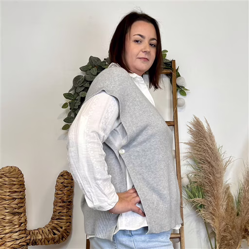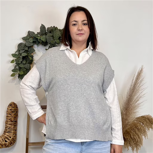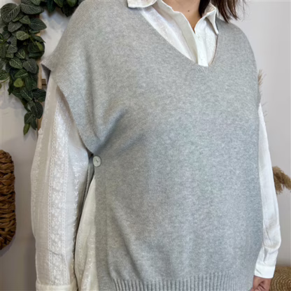 Pull sans manche de fabrication italienne. Col en V, en maille. Se ferme avec 1 bouton sur le coté laissant apparaître la pièce que vous avez choisi de glisser en dessous. Ici porté sur une blouse rayée, mais il sera tout aussi sympa sur un T-shirt pour un look casual.