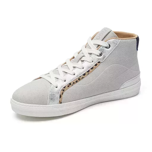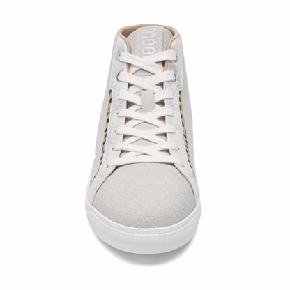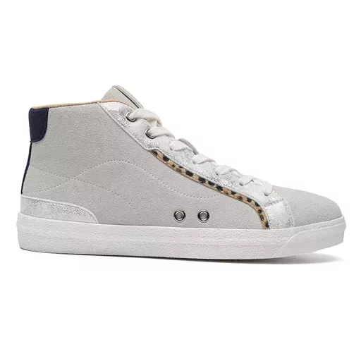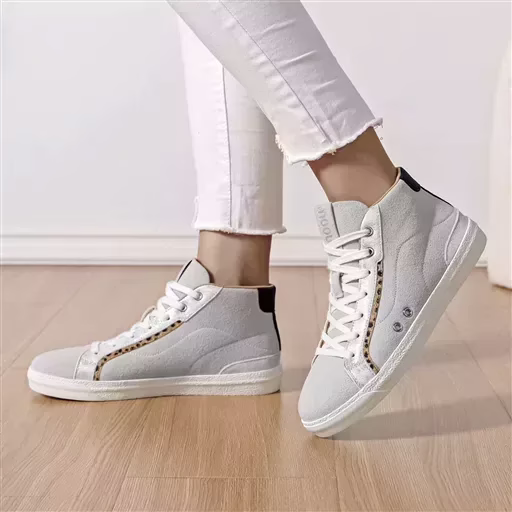 Tissus en contraste au niveau de la tige. Fantaisie en contour des lacets. Griffe de la marque MOOW au niveau de la languette. 7 trous