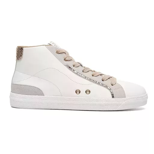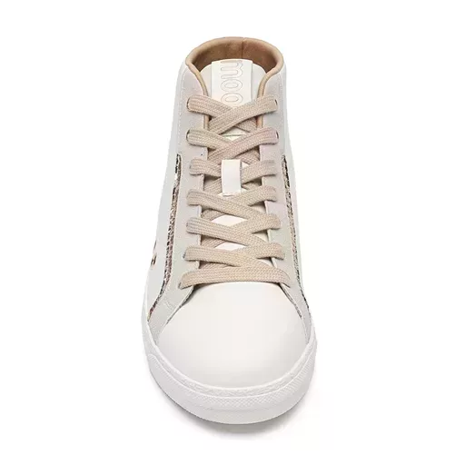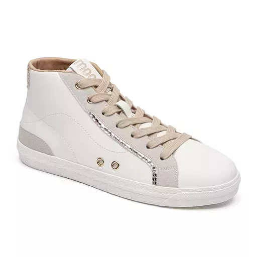 Tissus en contraste au niveau de la tige. Fantaisie en contour des lacets. Griffe de la marque MOOW au niveau de la languette. 7 trous
