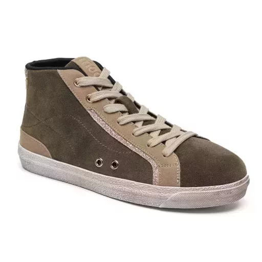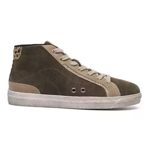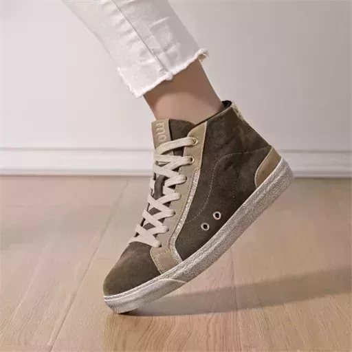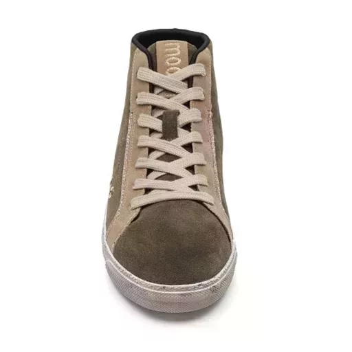 Tissus en contraste au niveau de la tige. Fantaisie en contour des lacets. Griffe de la marque MOOW au niveau de la languette. 7 trous