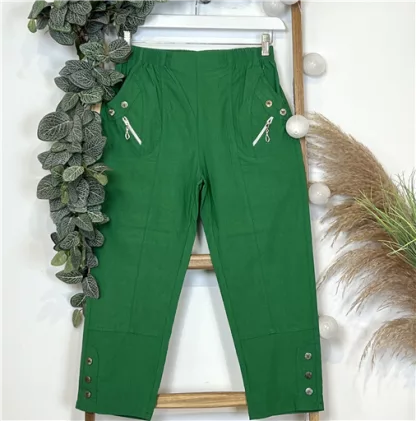 ATTENTION après mesures, nous avons déduit 2 tailles par rapport à l’étiquette cousue intérieure : Ce modèle classique est un indispensable dans les Penderies Confort : Pantacourt taille haute avec taille élastiquée et des poches sur les côtés. Belle profondeur, en stretch avec des zips fantaisies au niveau des poches 2 boutons. En bas 3 boutons apporteront de la fantaisie à ce modèle.