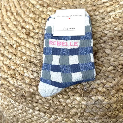 « REBELLE ». Un joli message pour ces chaussettes à paillettes à message proposées en tailles unique convenant de la taille taille 35 au 41. Fantaisies et stylées de la marque « Mes Petites Chaussettes ». Pour faire un cadeau, ou pour vous même… elles vous accompagneront en toutes circonstance. Accessoire facile à associer avec nos collections de Prêt à Porter Féminin Petites et Grandes Tailles.