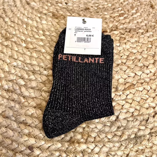 « PETILLANTE ». Un joli message pour ces chaussettes à paillettes à message proposées en tailles unique convenant de la taille taille 35 au 41. Fantaisies et stylées de la marque « Mes Petites Chaussettes ». Pour faire un cadeau, ou pour vous même… elles vous accompagneront en toutes circonstance. Accessoire facile à associer avec nos collections de Prêt à Porter Féminin Petites et Grandes Tailles.