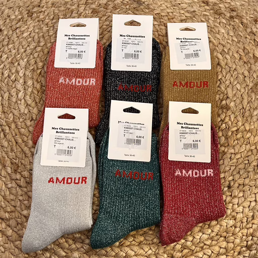 « AMOUR ». Un joli PATCH pour ces chaussettes à paillettes à message proposées en tailles unique convenant de la taille taille 35 au 41. Fantaisies et stylées de la marque. Pour faire un cadeau, ou pour vous même… elles vous accompagneront en toutes circonstance. Accessoire facile à associer avec nos collections de vêtements en Prêt à Porter Féminin Petites et Grandes Tailles .