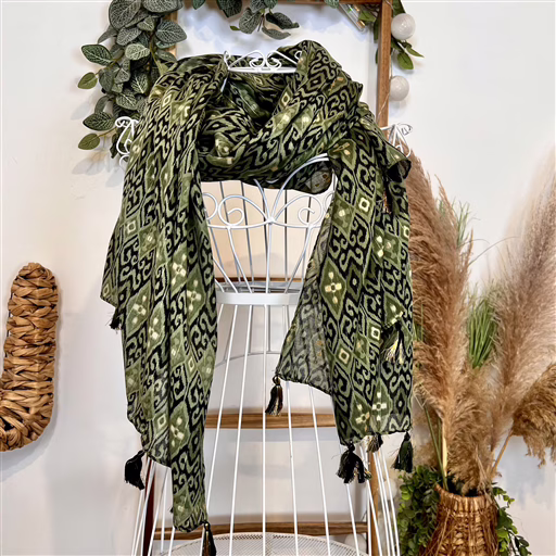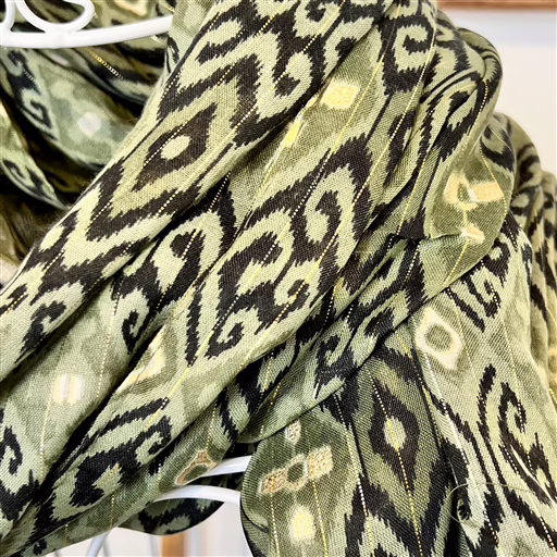 Ce foulard se distingue par son allure raffinée. Il arbore un motif géométrique avec des formes en losanges et arabesques répétée. Le tissu est souple et agréable, avec un joli drapé une fois enroulé autour du cou. Les extrémités sont finies par de petites franges. C’est l’accessoire idéal pour réchauffer et donner du caractère à une tenue sobre.