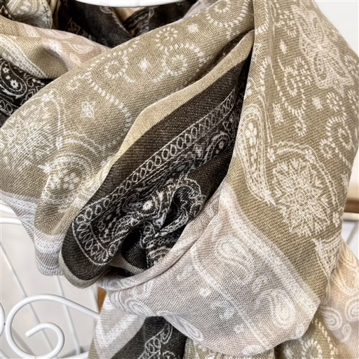 Le tissu léger est idéal pour un joli drapé au cou ou sur les épaules. Les extrémités sont finement frangées, ajoutant une touche décontractée. C’est un foulard facile à porter au quotidien, parfait pour donner un accent chic-casual à une tenue simple.