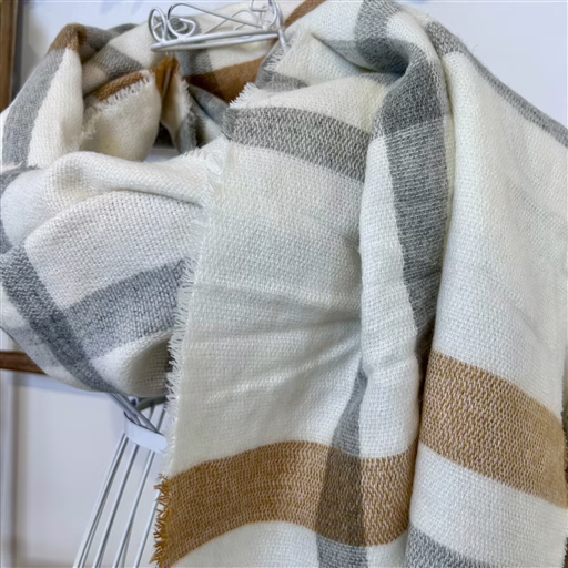 Son motif à grands carreaux mêlant des tons beige, gris et blanc cassé apporte une touche chic et intemporelle à vos tenues d’hiver. Ses bords délicatement effilochés ajoutent une note de naturel et de modernité.