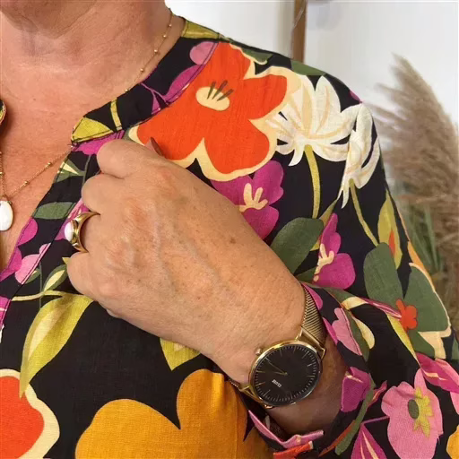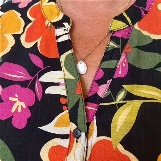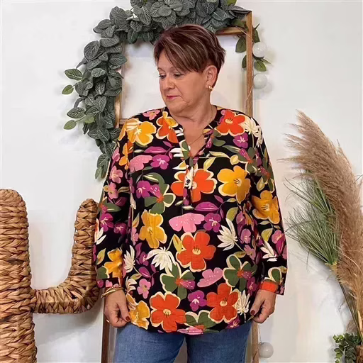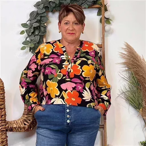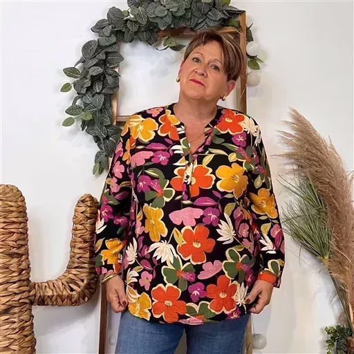 Un bel imprimé “Seventies” pour cette blouse signée Christy qui se porte facilement en cette saison. Blouse fluide imprimée “Jolies Formes”, ravissante aux manches longues avec finition poignets et lien pour remonter les manches. Encolure en V. Encolure bien dégagée, fermée par 3 boutons. Forme droite. Facile à associer avec un Christy de la marque, nos pantalons Confort JST, nos jeans Voggo à 18.90€ ou nos pantalons C’Mélodie.