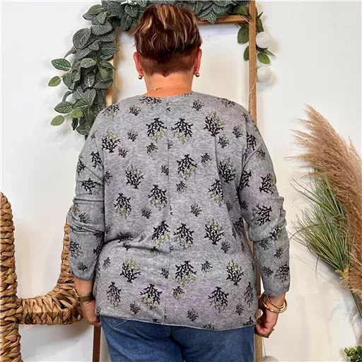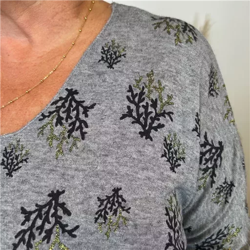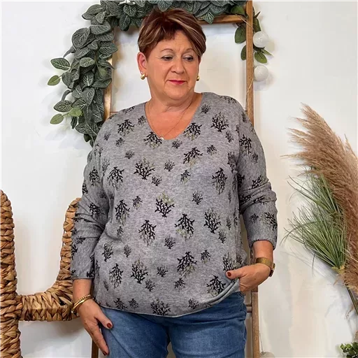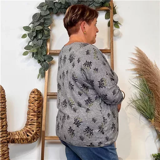 Pull imprimé proposé en taille unique, contenant de la laine. Touché duveteux convenant du 40/42 au 46/48 en fonction des différentes morphologies