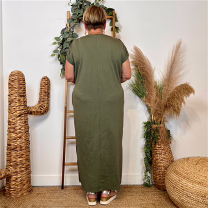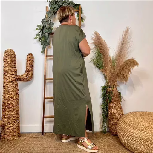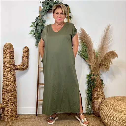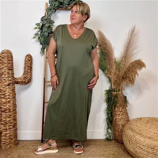 – « Robe longue fluide grande taille – Col V, fente élégante et poches pratiques »