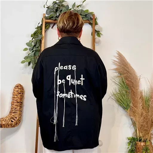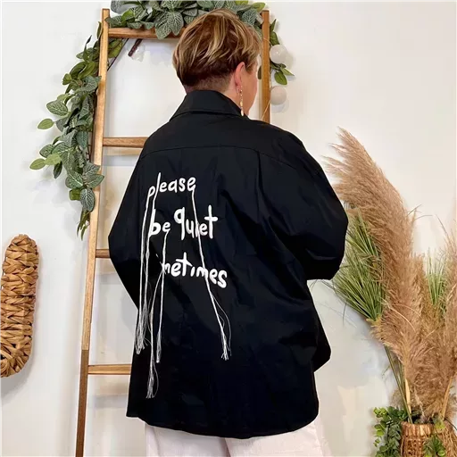 Élégante et originale, cette chemise unie signée Mina Rosa se distingue par ses boutons en forme de cœur noir et blanc et sa fabrication soignée en Italie. Dans le dos, un message poétique taggé « Please be quiet sometimes » — traduit par « S’il te plaît, sois tranquille parfois » — agrémenté de fils pampilles pour une touche design chic.