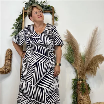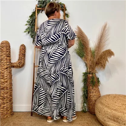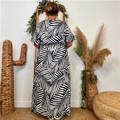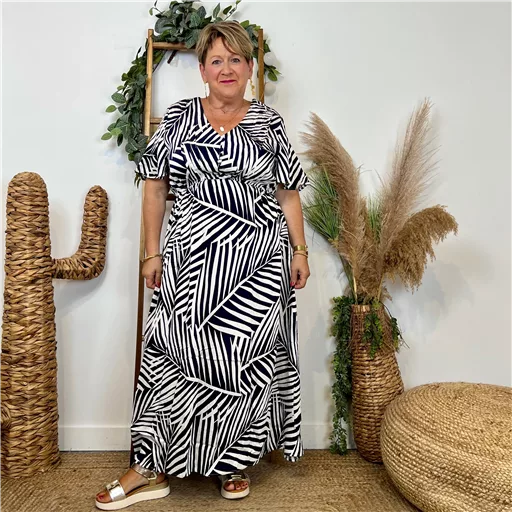 Robe longue très colorée, motif zébré avec de petites feuilles dorées proposée du 44 au 52.