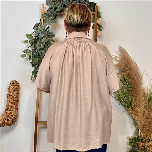 Chemise à col, idéale pour la rentrée. Une pièce de fabrication italienne qui allie simplicité et originalité. Son col v apporte mettra en valeur le décolleté, son froncé au niveau du cou affirme le style de cette chemise. Maches courtes, cette chemise sera sublime sur un top ou un débardeur uni en toute occasion.